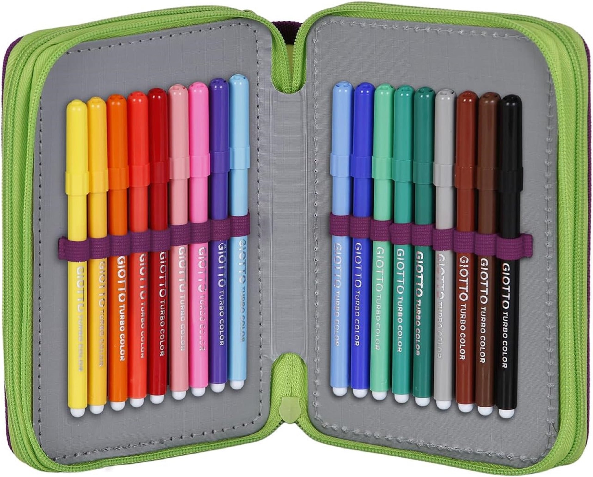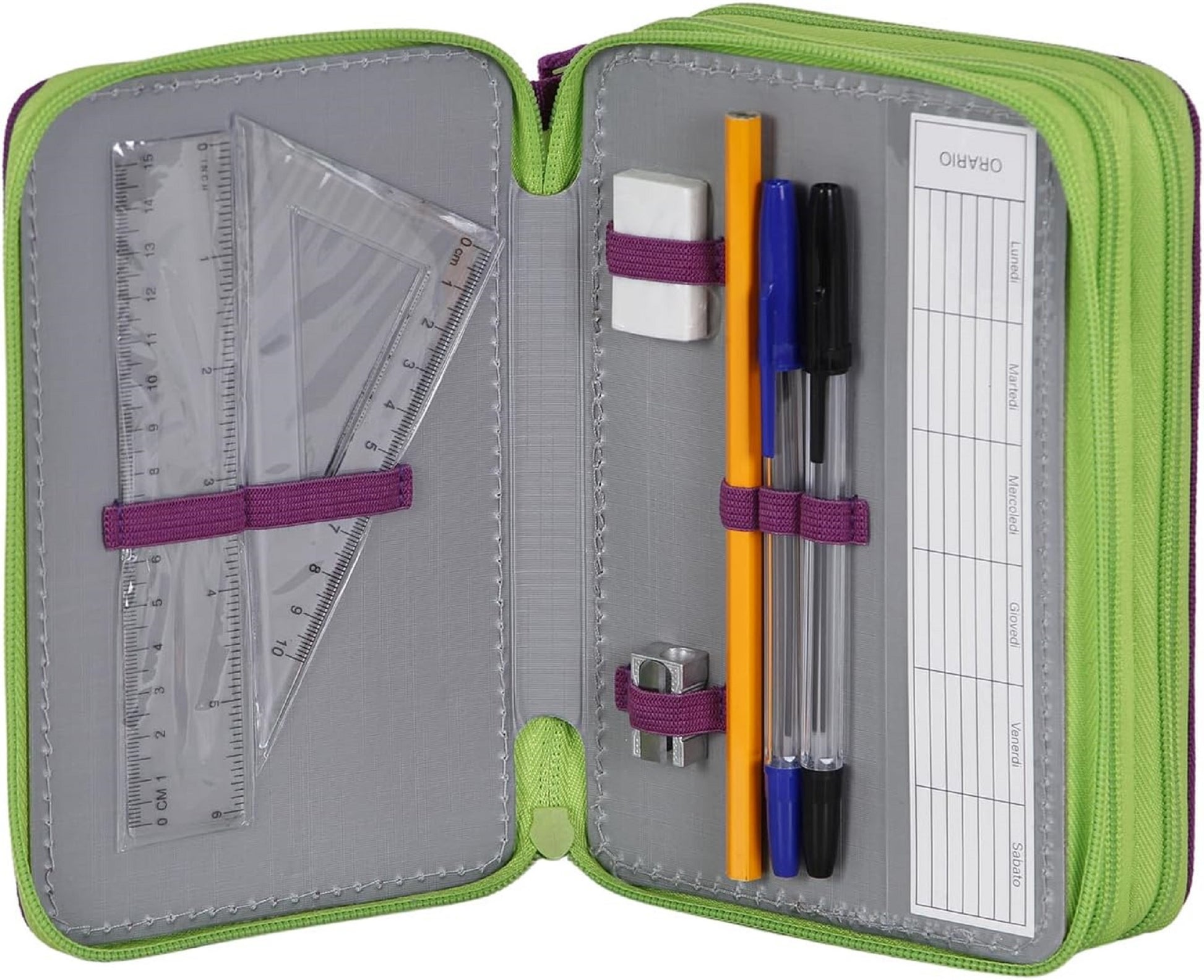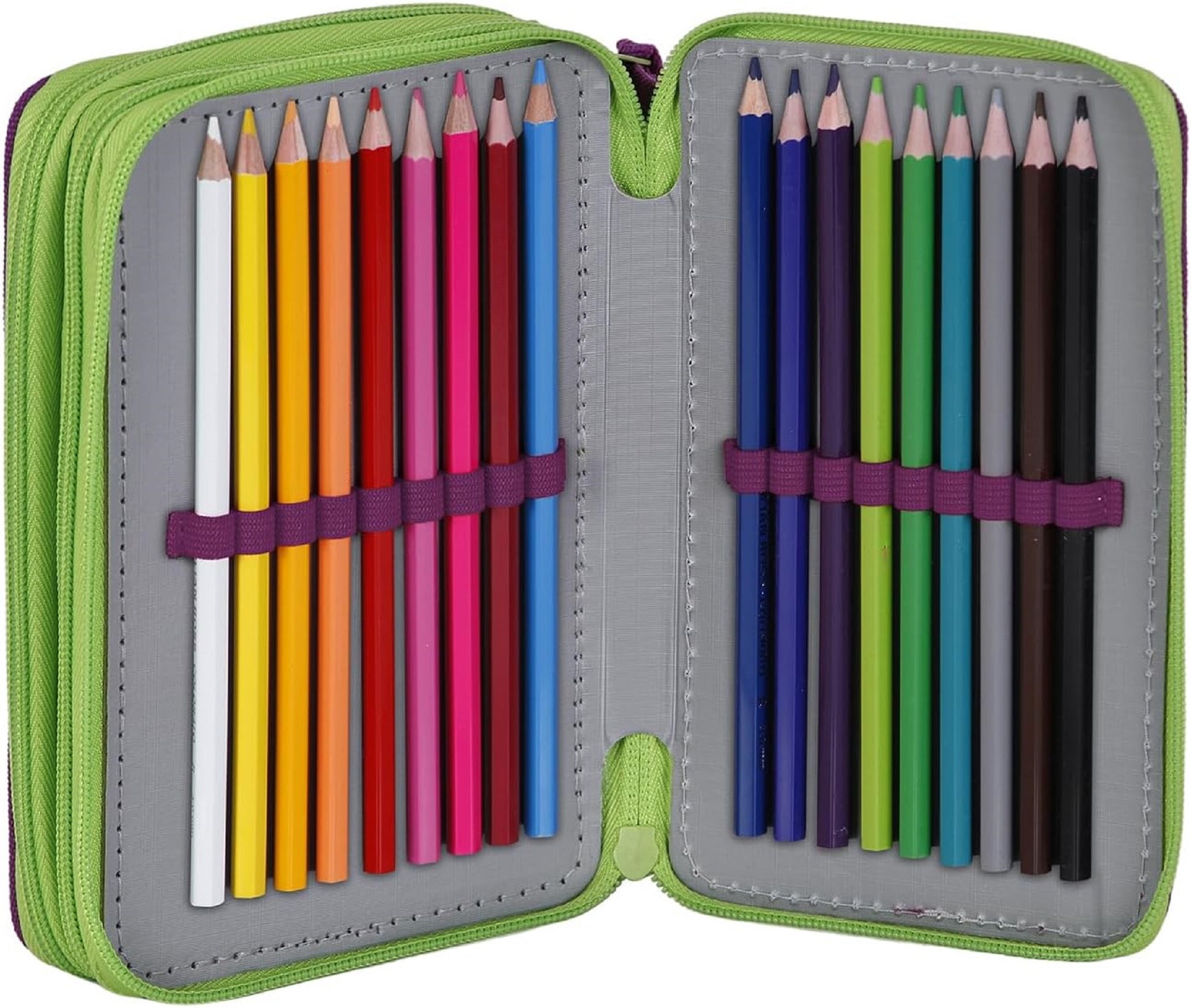 Komplett ausgestattetes, dreifaches Federmäppchen. Enthält 1 Notizblock im Post-it-Format mit 15 Seiten, 1 Anspitzer, 1 Radiergummi, 1 Bleistift, 2 Stifte (schwarz und blau), 18 Buntstifte und 18 Filzstifte.