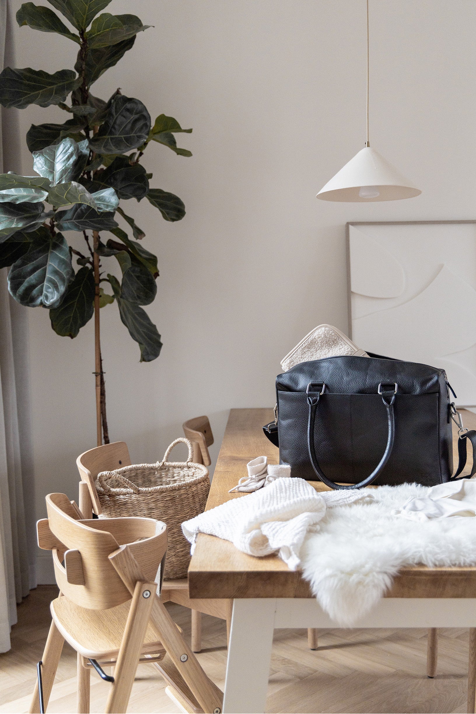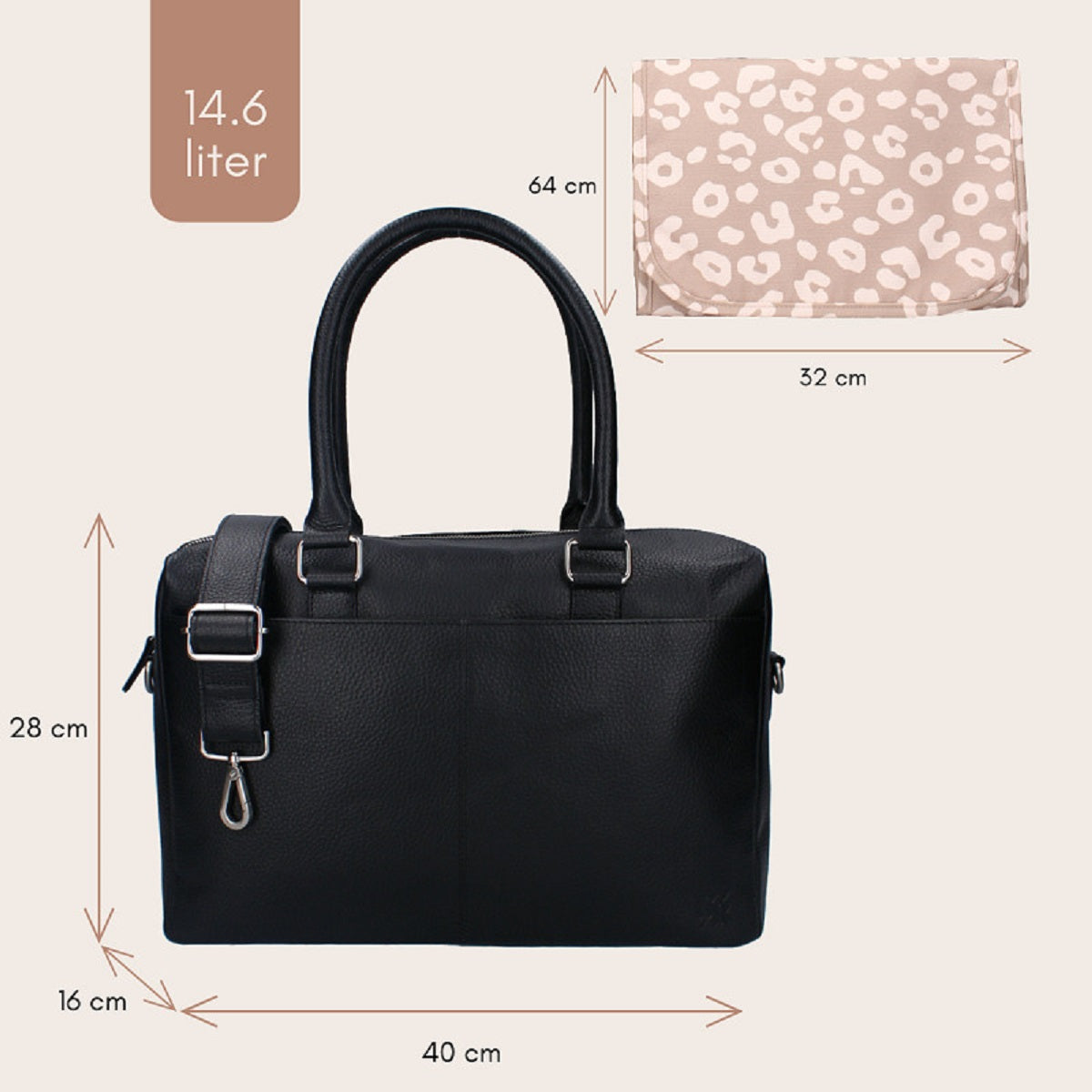 Mit den neuen Wickeltaschen aus Leder von Kidzroom können alle Eltern stilvoll unterwegs sein. Die Wickeltaschen aus der Lovely Leather Kollektion sind stilvoll und praktisch mit einem geräumigen Hauptfach und verschiedenen Taschen. Die taupefarbene Wickeltasche ist aus hochwertigem Leder gefertigt, so dass man sie überallhin mitnehmen kann. An den stabilen Griffen lässt sie sich leicht tragen. Außerdem ist sie mit einem verstellbaren und abnehmbaren Schultergurt ausgestattet. Auf der Vorderseite der Tasche befindet sich eine große Vordertasche für Dinge, die man schnell zur Hand haben möchte. In dem großen Fach befinden sich mehrere Fächer mit Gummibändern, in denen man leicht einen Becher unterbringen kann. Auf der Rückseite der Tasche befindet sich eine große Tasche für zusätzlichen Stauraum. Die Wickeltasche enthält eine Wickelunterlage, mit der Sie Ihr Baby überall und jederzeit wickeln können. Passende Kinderwagenhaken (2 Stück) für die Lovely Leather Kollektion sind separat in vier Farben erhältlich. Die Wickelauflage ist 64 x 32 cm groß und hat eine leicht herausnehmbare Innenseite.