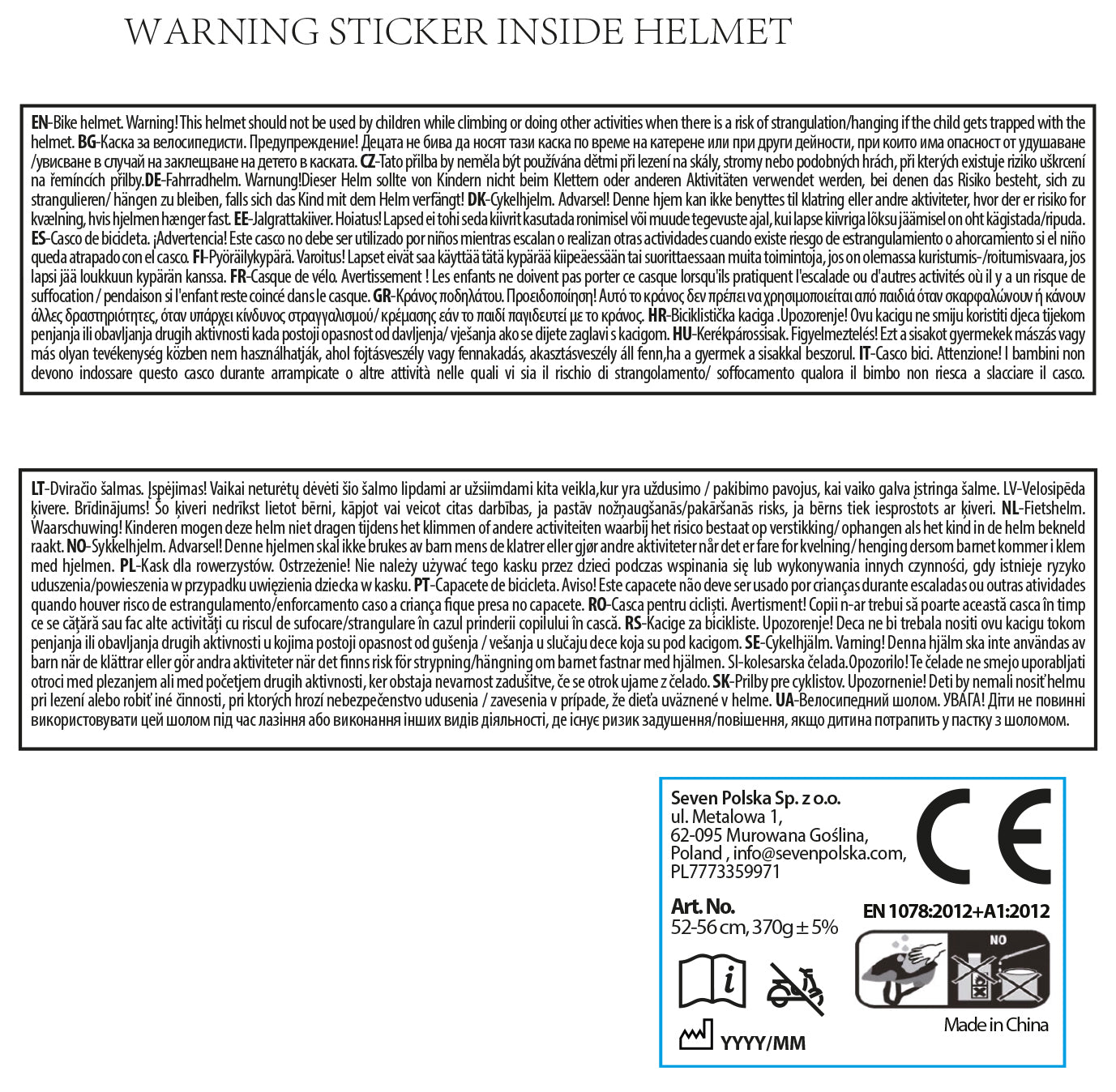 Warnhinweis: Dieser Helm sollte nicht von Kindern beim Klettern oder bei anderen Aktivitäten verwendet werden, bei denen die Gefahr besteht, dass sich das Kind mit dem Helm verfängt oder strangulieren könnte.