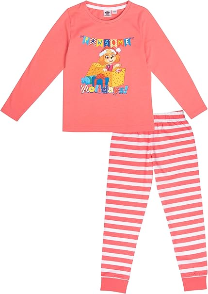 Paw Patrol XMAS Schlafanzug für Mädchen - Christmas Kinder Winter Pyjama Set Weihnachten Langarm Oberteil mit Hose Coral/Weiß