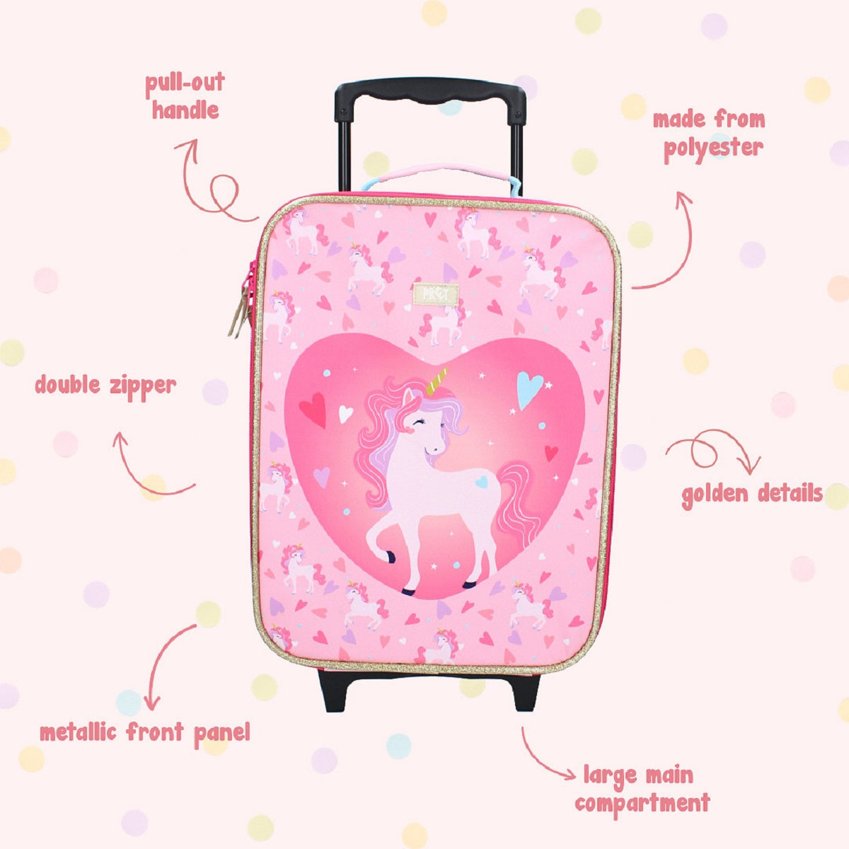 Entdecken Sie diese Welt mit diesem fabelhaften rosa Einhorn von Prêt aus der Made To Roll Kollektion! In hübschen rosa Farben. Dieser Trolley ist perfekt für Einhorn-Fans. Er verfügt über ein geräumiges Hauptfach, auf dem das Einhorn selbst aufgedruckt ist. Der Trolley hat einen praktischen, ausziehbaren Griff, der das Rollen erleichtert, und bietet genug Platz, um all deine Sachen zu transportieren. Der Trolley ist leicht zu öffnen und zu schließen. Füge diesen coolen Trolley jetzt zu deiner Sammlung hinzu!